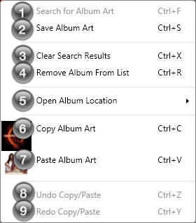 Ctrl+V | Paste Album Art | Pastes the image in the clipboard into the album artwork results as an album artwork option to be saved. |