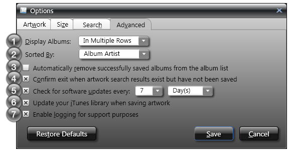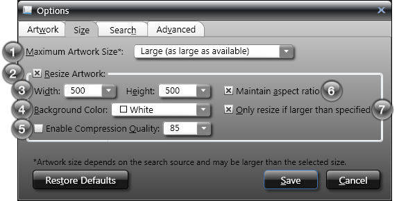 Alt+M | Maximum Artwork Size | Determines the maximum artwork image size to download. If the exact size is not available, the next closest size will be used. *Artwork size depends on the search source and may be larger than the selected size. |