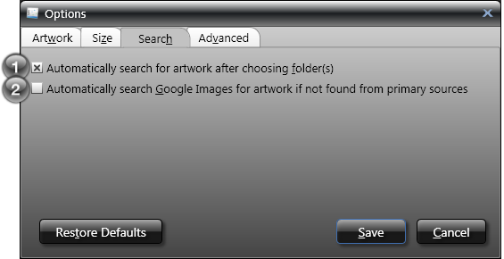 Search Google Images | If no album artwork was found, clicking this button will search Google Images using the Album Title and Artist listed below (8 and 9). | ||